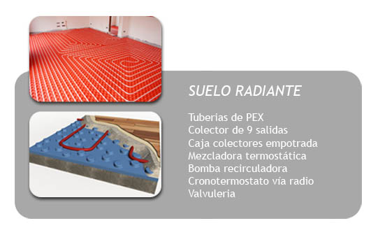 La calefacción por suelo radiante consiste básicamente en la emisión de calor por parte del agua que circula por tubos embebidos en la placa de hormigón que conforma el suelo, con lo que conseguimos una superficie realmente amplia como elemento emisor de calor. En invierno el agua recorre la tubería integrada en el suelo a una temperatura en torno a los 35-40 ºC y aporta el calor necesario para lograr una temperatura de confort en la vivienda.